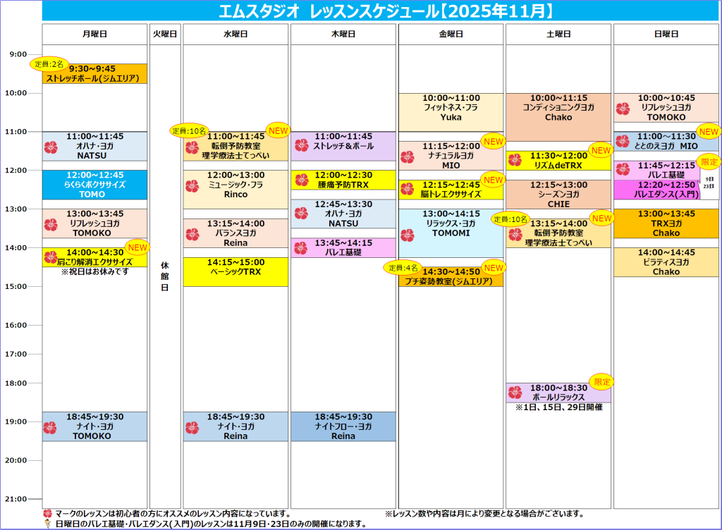 2025年11月1日以降のレッスンスケジュールを公開いたします。