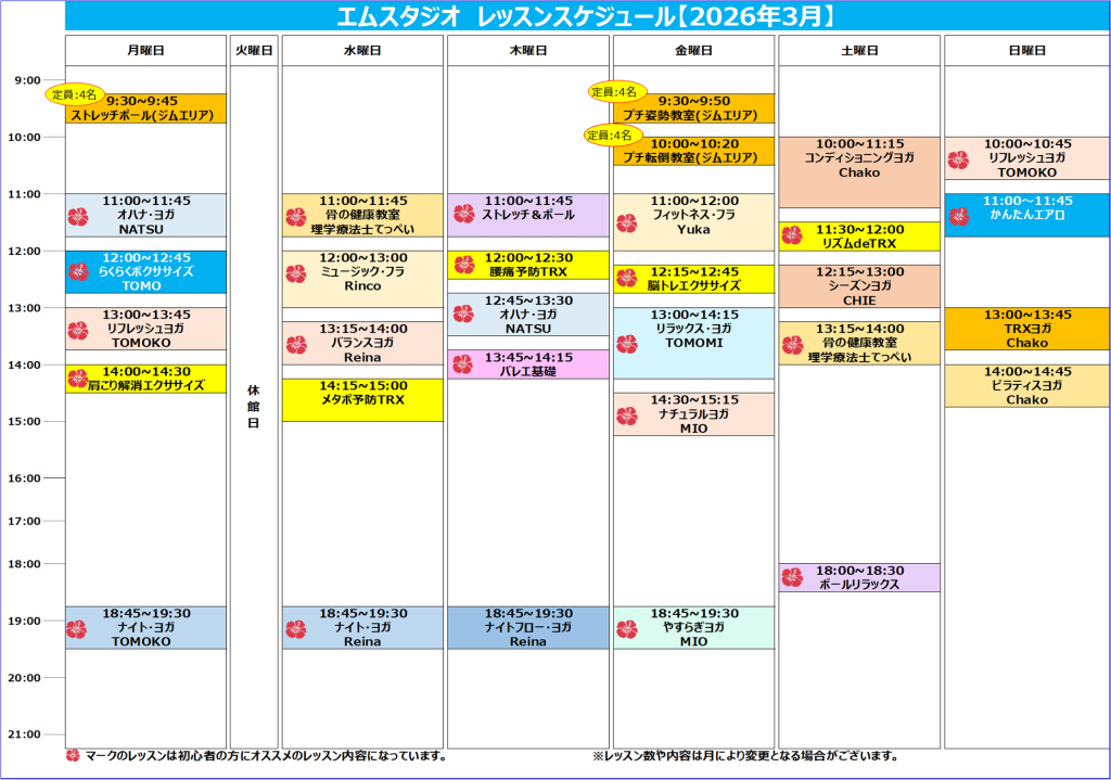 2026年3月1日以降のレッスンスケジュールを公開いたします。
